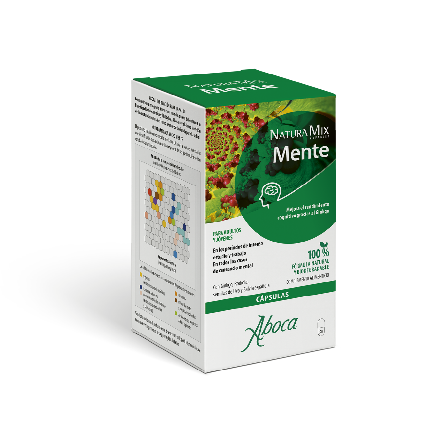 Natura Mix Advanced Mente contiene el extracto de Ginkgo, que mejora el rendimiento cognitivo, y el aceite esencial de Salvia española, que mejora el rendimiento mental y ayuda a mantener la concentración, la atención y la memoria.