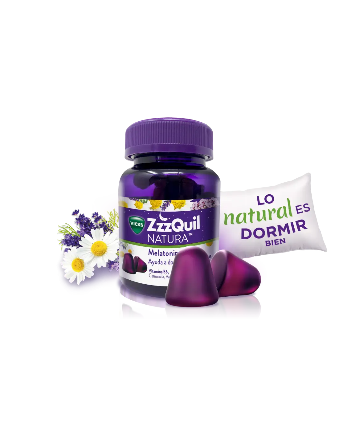 ZzzQuil Natura es un suplemento natural para dormir con melatonina, que te ayuda a conciliar el sueño de forma natural y rápida, mejorando la calidad del descanso con una combinación de extractos de plantas medicinales.
